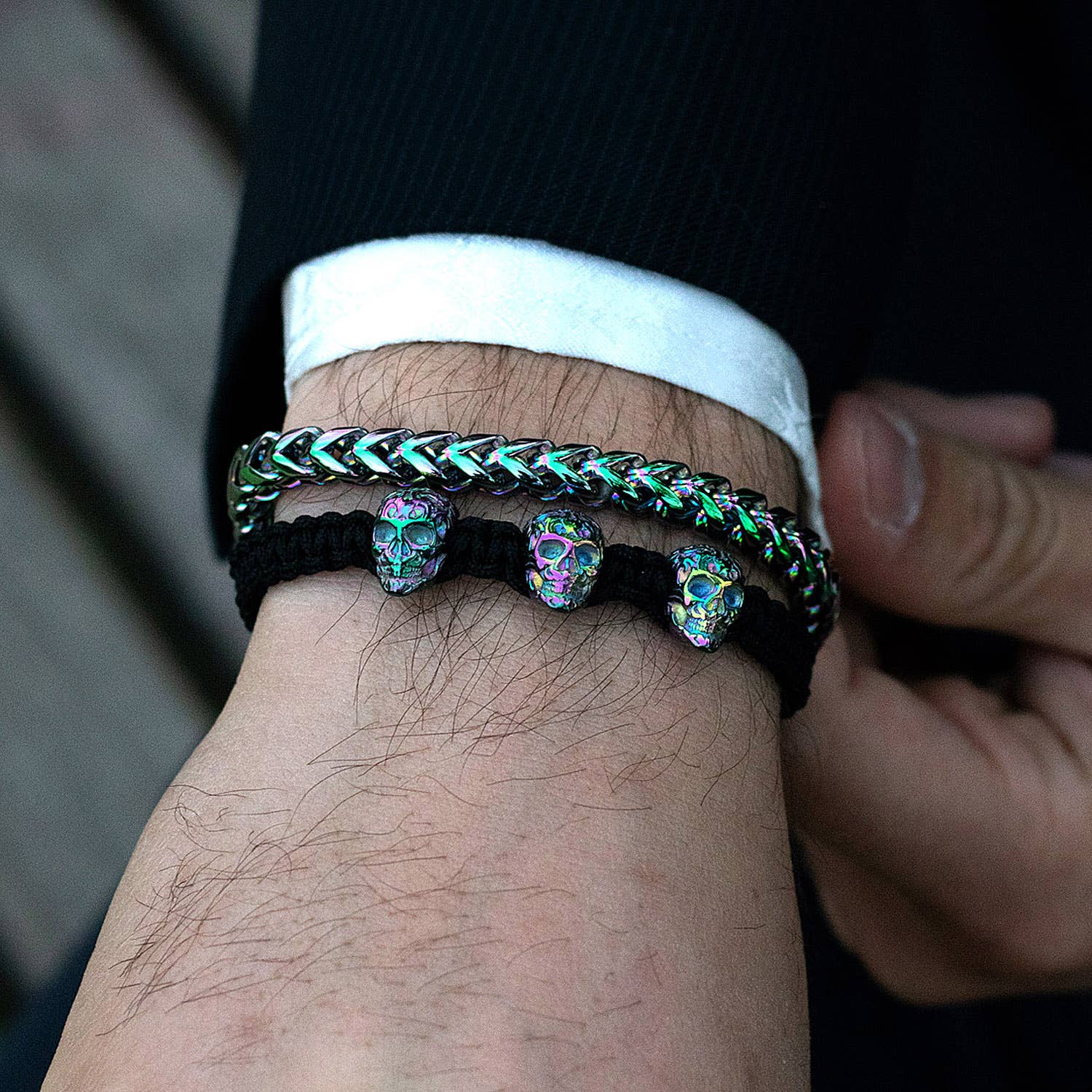 The bracelet comes in 2 color options which are blue or iridescent.