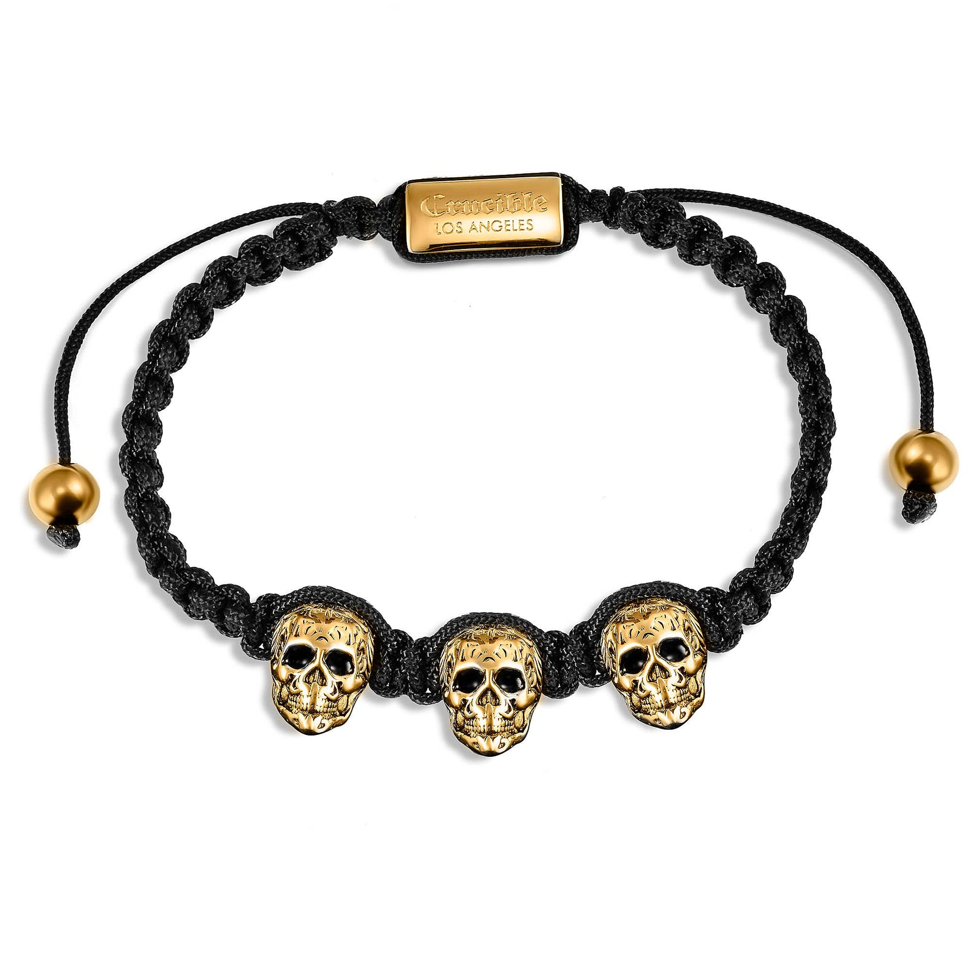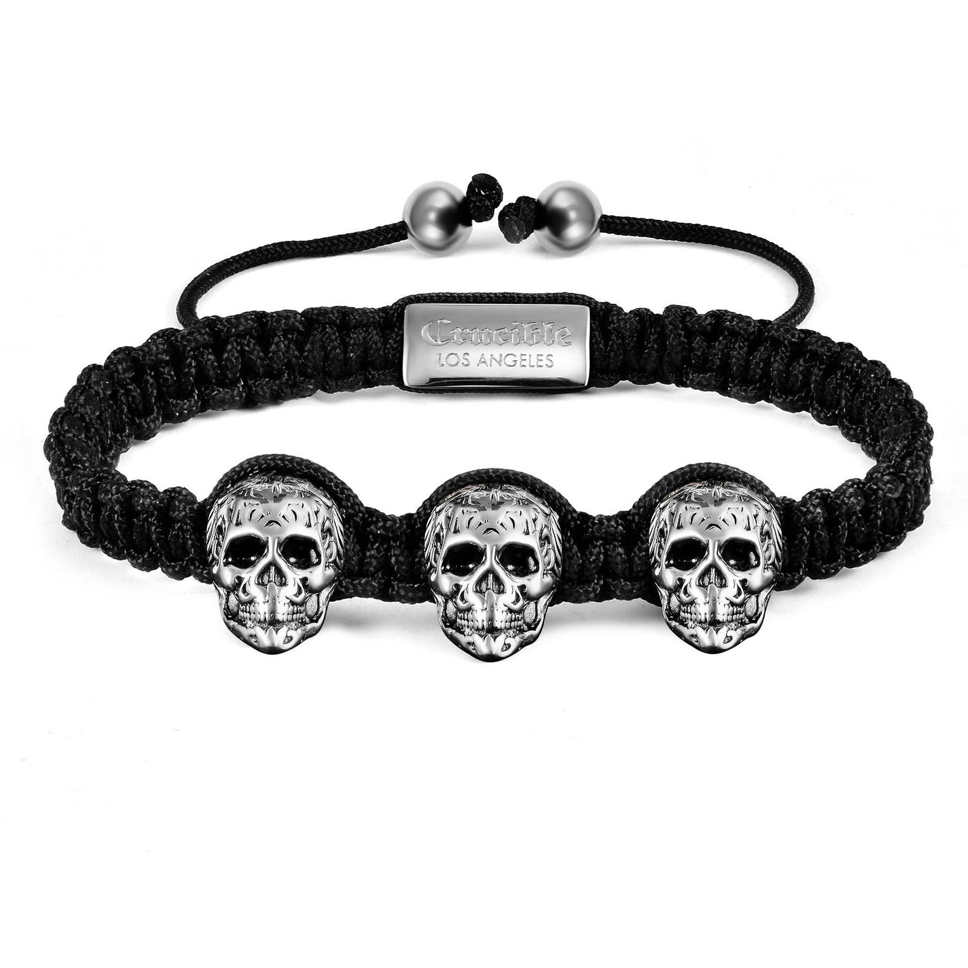 Wear this edgy Crucible Jewelry adjustable bracelet featuring three detailed Crucible skulls.