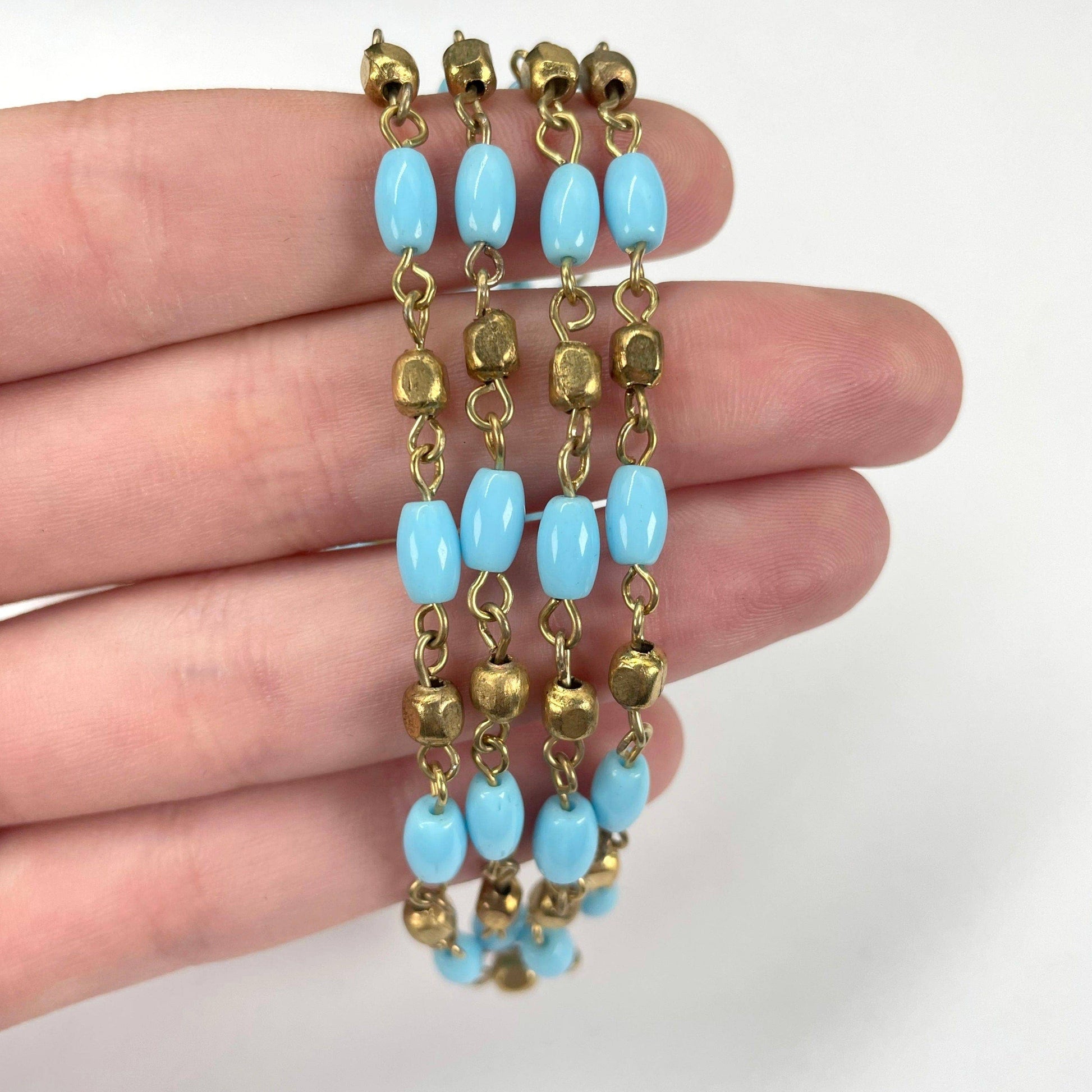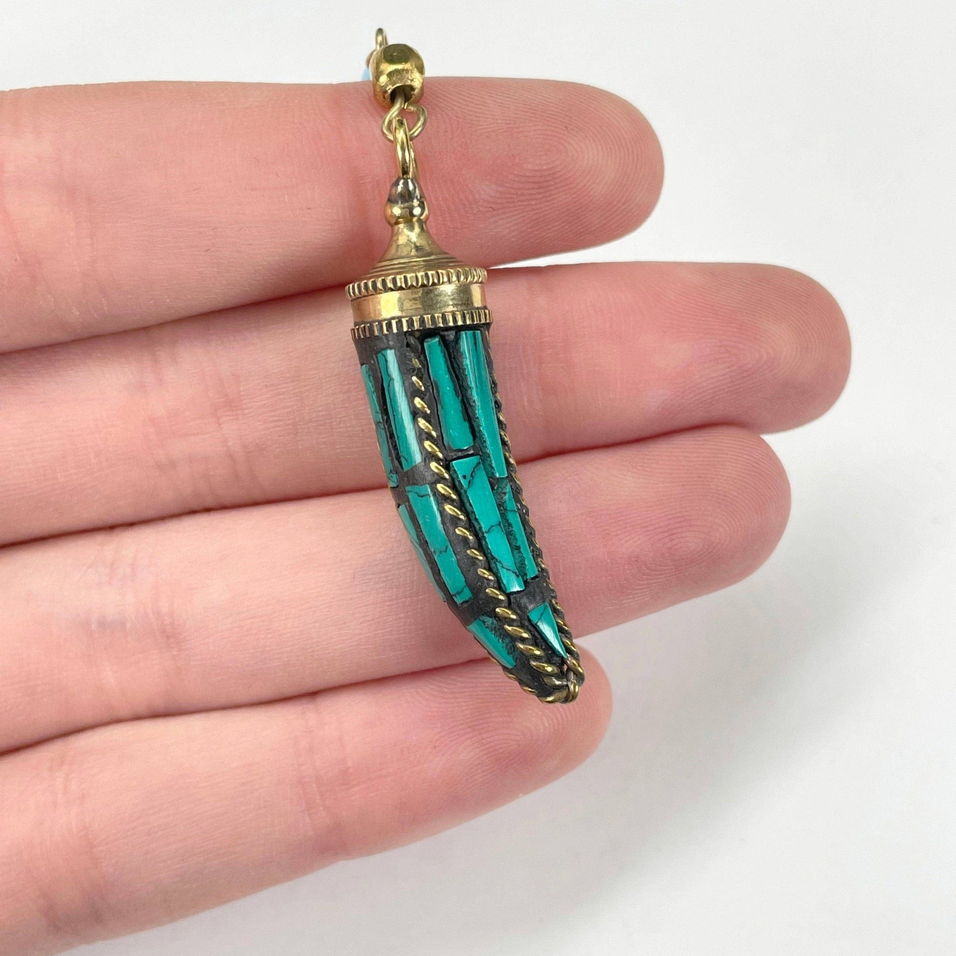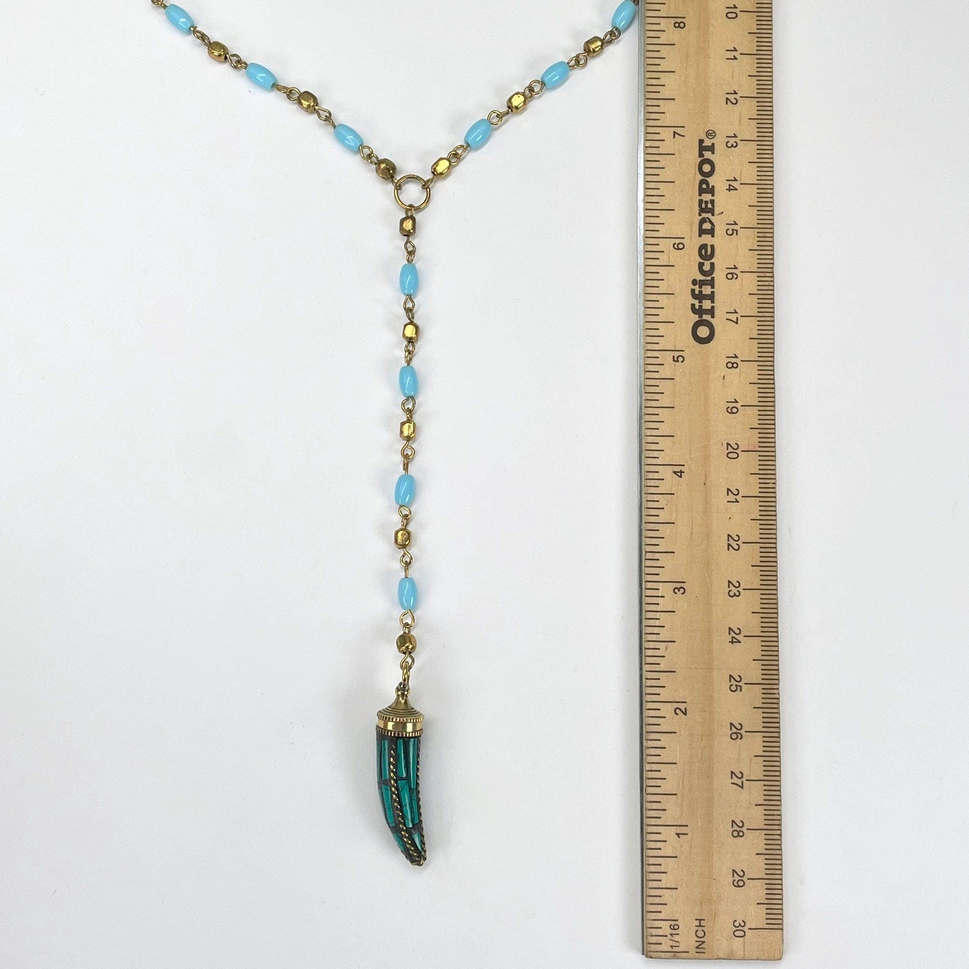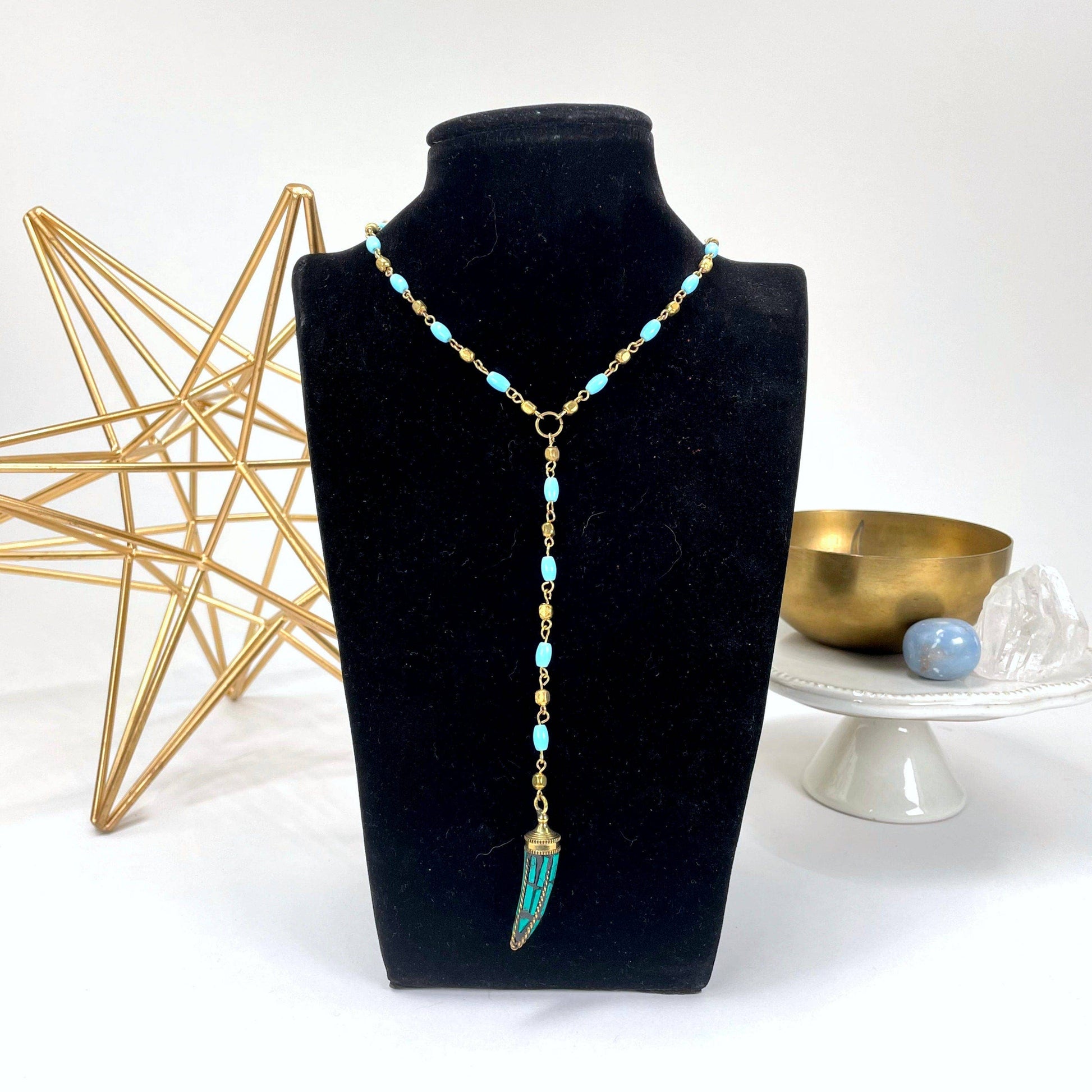 This Tibetan Style Beaded Necklace with Turquoise Horn Pendant is a statement piece! Complete any outfit with this stunning and eye catching necklace. It features beautiful light blue and gold beads and a turquoise and gold horn pendant. Make this unique piece yours today or gift it to someone special you know!