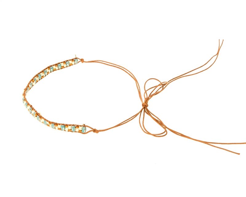 Hat band in waxed cord with painted blue beads + beige and brown wood beads.